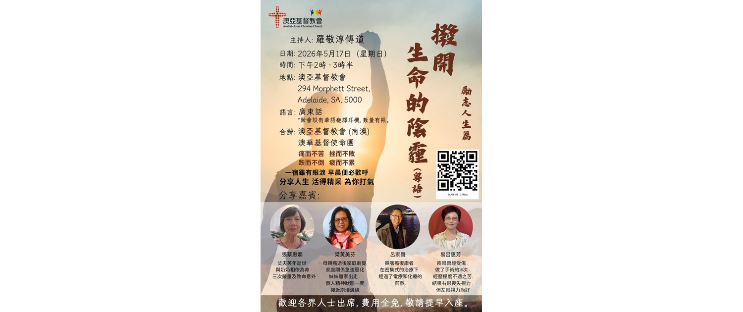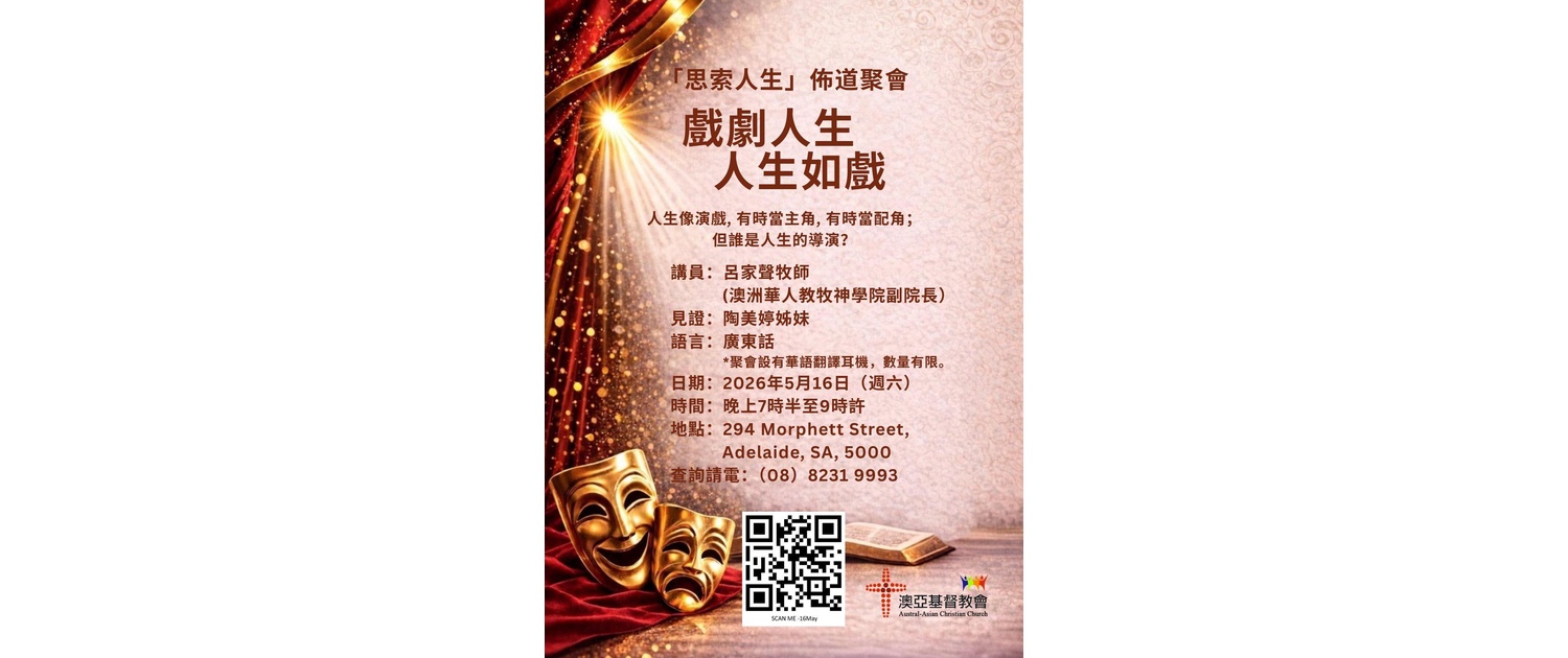 今週禱告事項1)為教會16/5 的佈道會和17/5 見證分享會禱告。求主使用這兩個聚會﹐引領未信者歸主﹐並讓弟兄姊妹生命得著激勵和造就。 2) 為中東局勢對澳洲民生的影響禱告︰因著汽油價格與生活成本增加﹐很多家庭面對經濟的壓力﹐人心焦慮不安。求主賜下平安和盼望﹐堅固受影響家庭的信心。